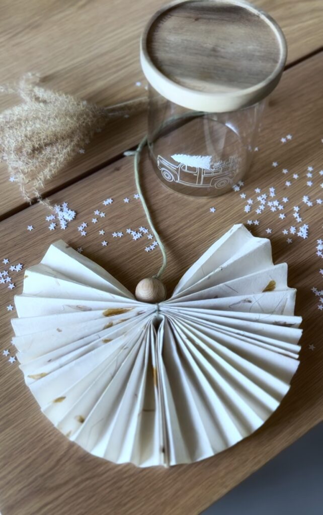 Als erstes faltest du die beiden Blätter wie eine Ziehharmonika. Wenn du möchtest kannst du das zweite Blatt etwas kleiner machen, so werden die Flügel des Engels etwas kleiner. Danach in der Mitte falten und die beiden Fächer zusammen kleben. Mit dem Faden in der Mitte zusammen binden und dann oben noch die Kugel befestigen. Fertig ist der Papierengel.