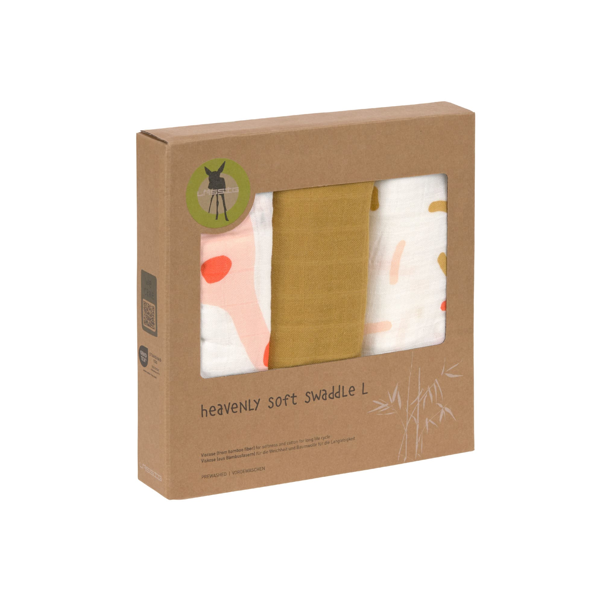 Die drei multifunktionalen 80 x 80 cm großen Mulltücher von LÄSSIG sind zu 70 % aus Viskose (aus Bambusfaser) sowie zu 30 % aus Baumwolle gefertigt.