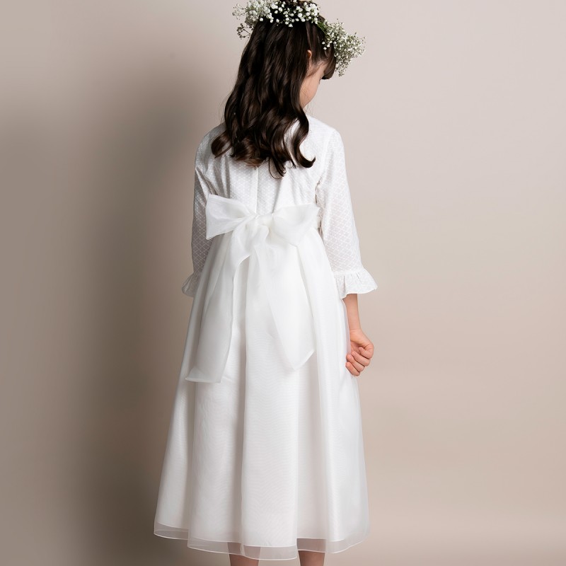 Kommunionkleid, für besondere Anlässe in cremefarben mit hoher Taille geschnitten – oberhalb der Taille abgeschnitten und gerafft das Oberteil des Kleides ist aus Baumwollstoff, der in einem zarten Muster mit Blumen bestickt ist. Unterteil aus Organza, unterer Deckschicht und Baumwollfutter. Ärmel mit Rüschen. An der Taille befestigte Organza-Schärpe, die hinten zu einer Schleife gebunden wird, sodass das Kleid angepasst werden kann Kleid mit Baumwollfutter gefüttert auf der Rückseite mit einem Reißverschluss, der mit einer Baumwolllasche bedeckt ist.