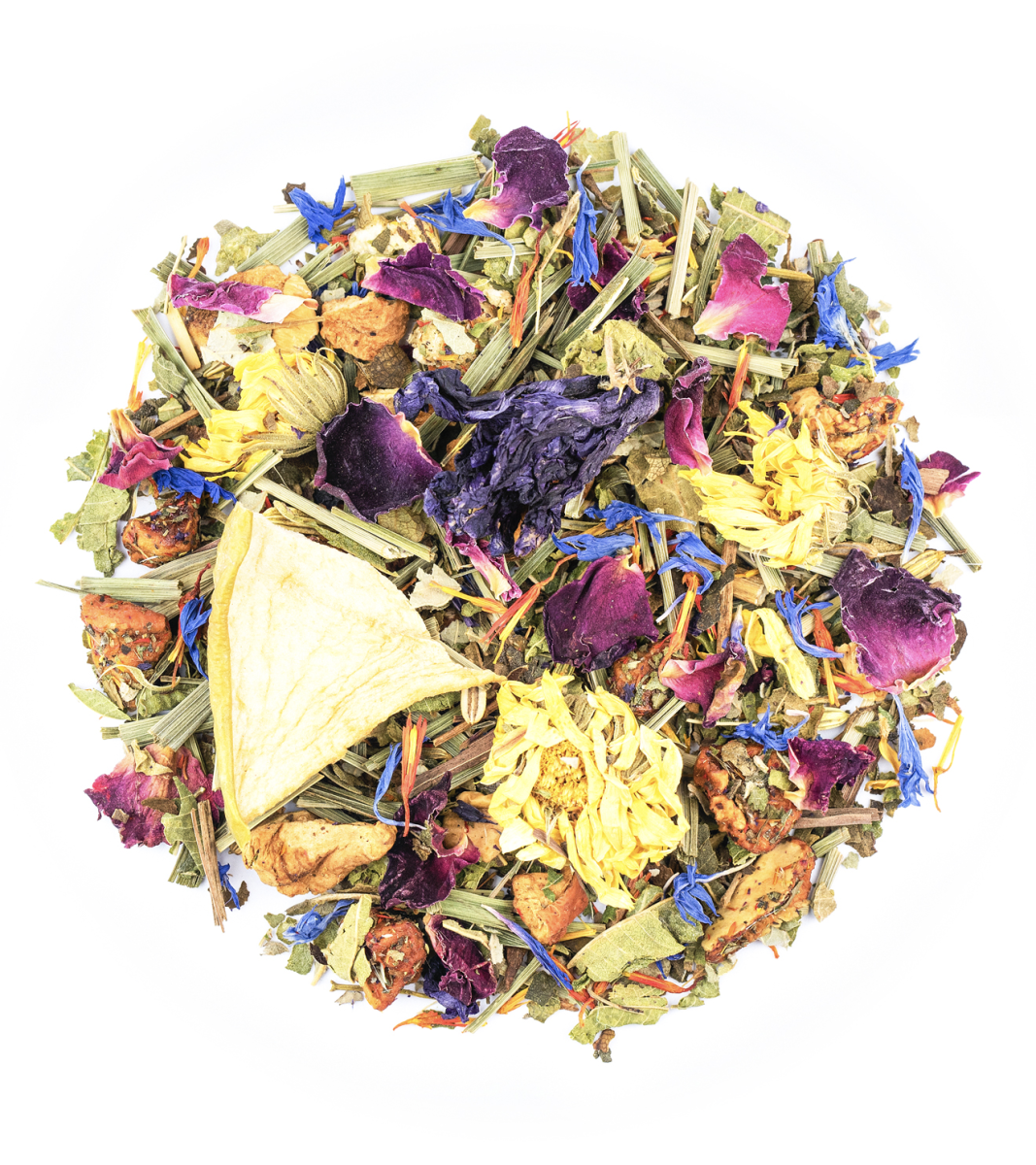 Gesäuerte Apfelstücke (Apfel, Säuerungsmittel: Citronensäure), Apfelstücke, Lemongras, Zitronenverbenenblätter, Fenchel, Walderdbeerblätter, Brombeerblätter, Apfelspalten, Aroma, süße Brombeerblätter, gefr.-getr. Birnenstücke, Färberdisteln, Ringelblumen, Rosenblüten, Kornblumen, Malvenblüten.
